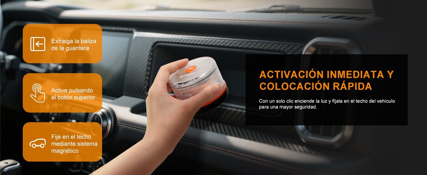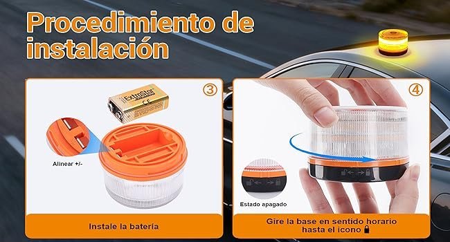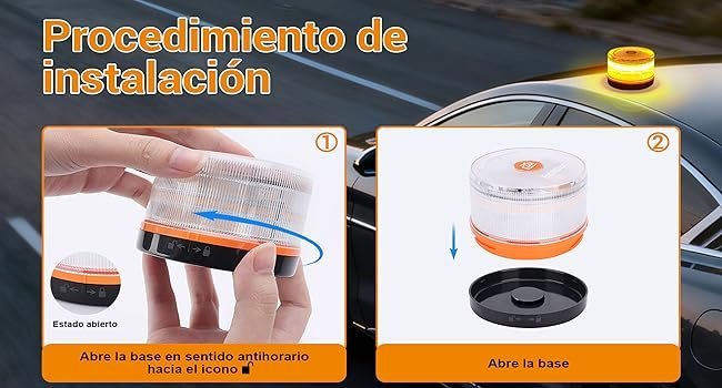 Se coloca en el techo del vehículo mediante un potente imán o ventosa. No requiere instalación eléctrica ni herramientas. Funciona con pilas o batería recargable.